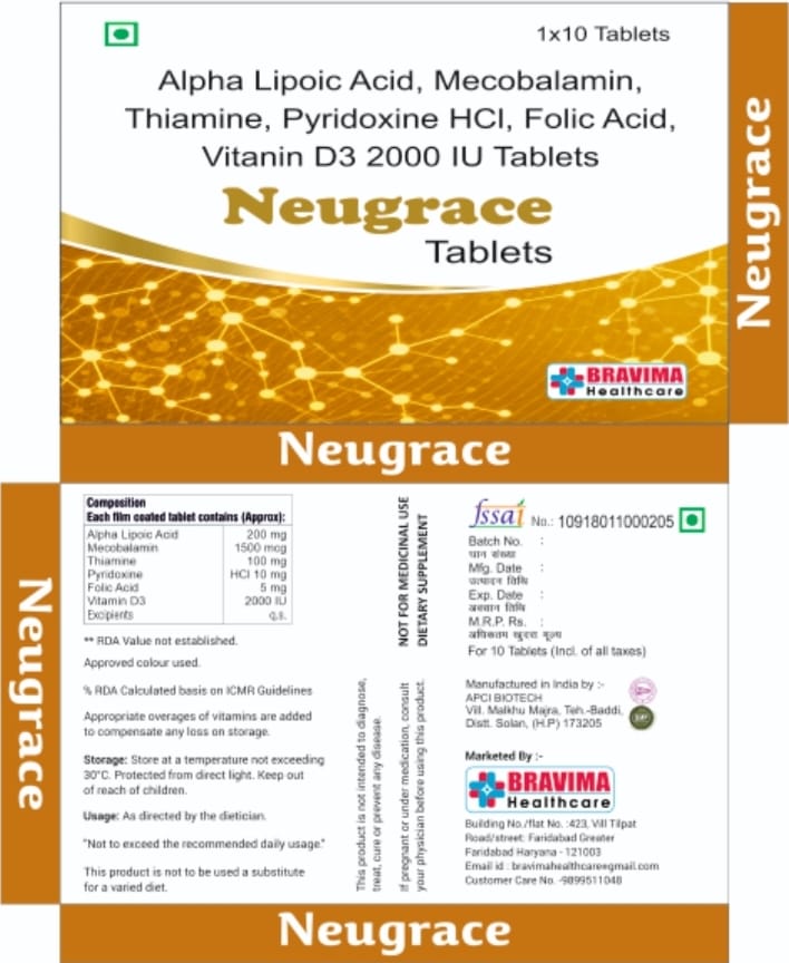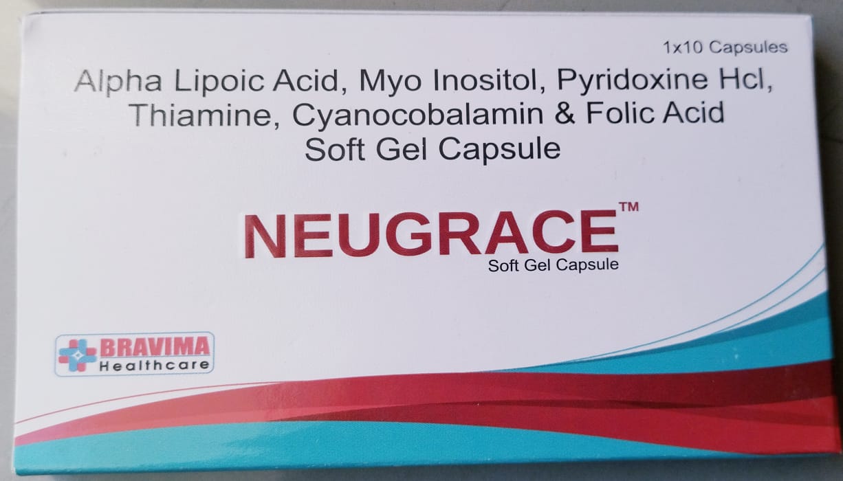 Cap. NEUGRACE contains a combination of vitamins and minerals, including alpha lipoic acid, folic acid, and cynocobalamin (vitamin B12), Thiamine pyridoxine Is a nutritional supplements. It is taken to treat conditions caused by deficiency of vitamins , minirals and other nutrients in the body . It also ensure proper growth and functioning of the body.