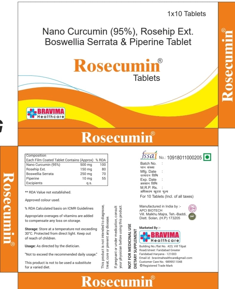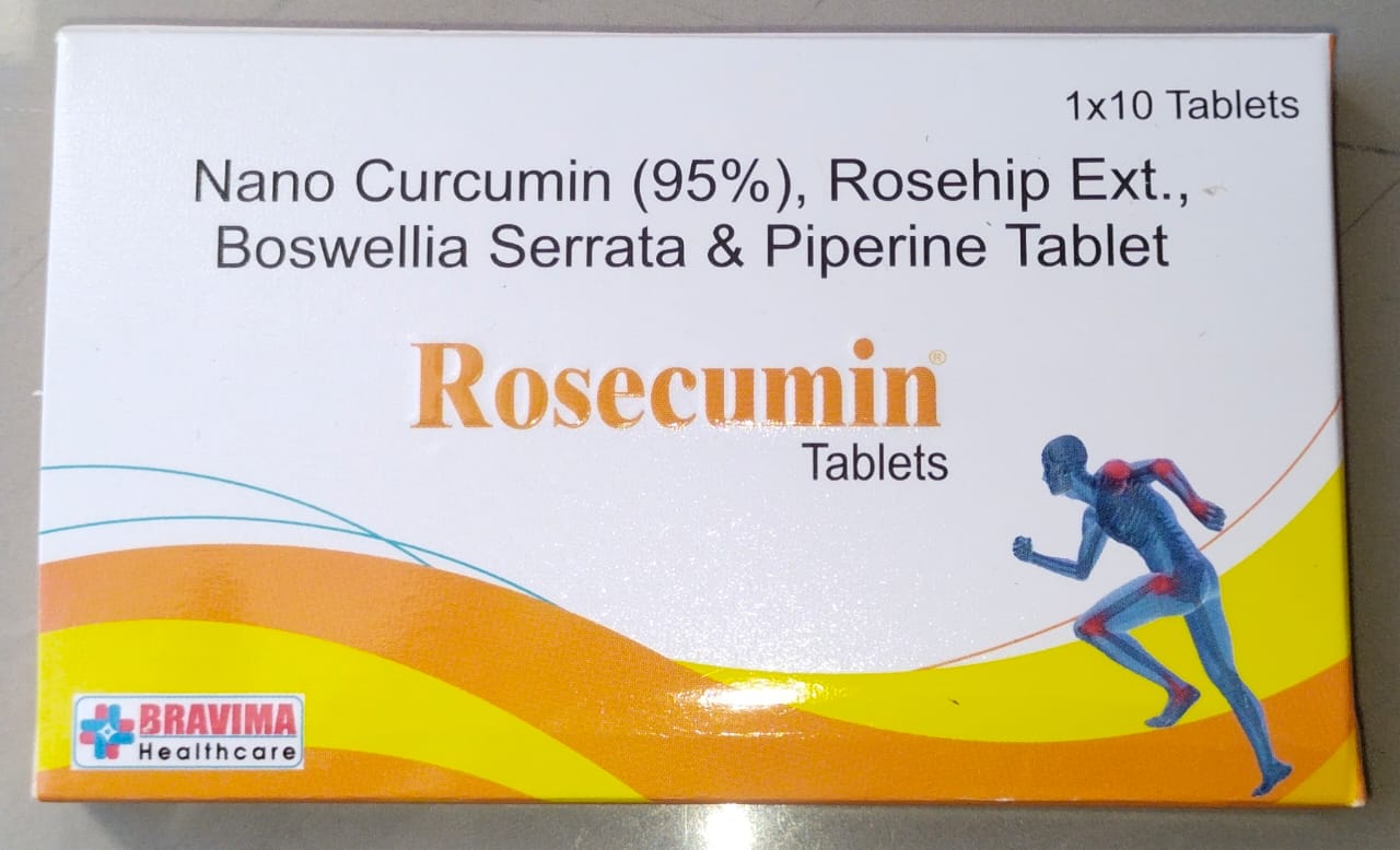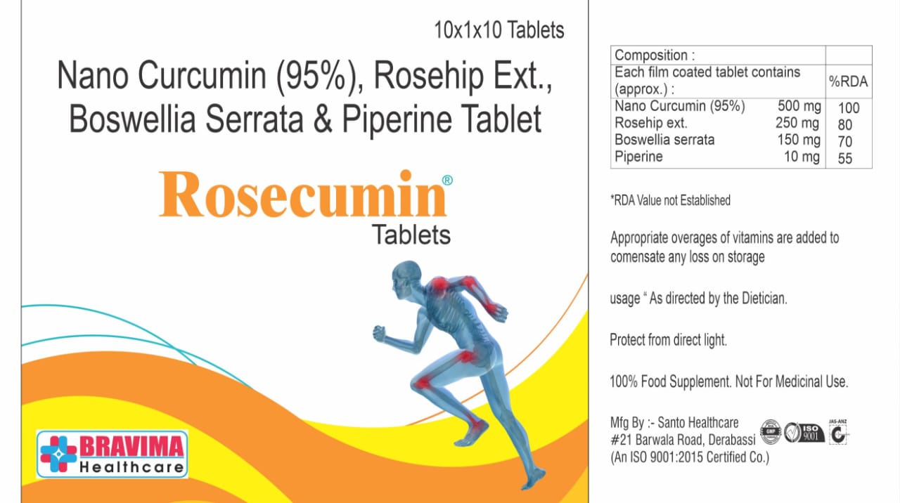 ROSECUMIN Tablet is a nutritional supplement that treats nutritional deficiencies and aids in the growth and development of the body. It contains Nano curcumin 95% , Bosswellia serata , Rosehip ext. And piperine . It is essential in building the overall health and well-being of the body.